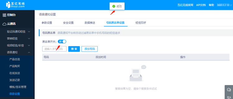 路径[控制台>语音通知短信>短信设置],右侧中[号码黑名单设置],可对对应功能进行调整配置。